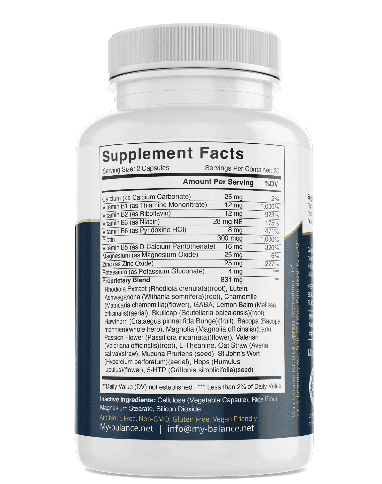 Our Stress Relief supplement also includes a blend of B-vitamins (B1, B2, B3, B5, B6, B7) and essential minerals like calcium, magnesium, zinc, and potassium. These nutrients are vital for maintaining overall health and supporting the body's response to stress.